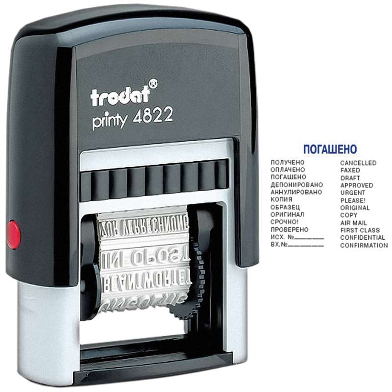 Штамп с 12 бухгалтерскими терминами: ПОЛУЧЕНО, ОПЛАЧЕНО, ПОГАШЕНО, ДЕПОНИРОВАНО, АННУЛИРОВАНО, КОПИЯ, ОБРАЗЕЦ, ОРИГИНАЛ, СРОЧНО! ПРОВЕРЕНО, ИСХ.№__, ВХ.№ __ . Шрифт букв - 4 мм, одна строка.Штамп Trodat, с 12 бухгалтерскими терминами, 4мм