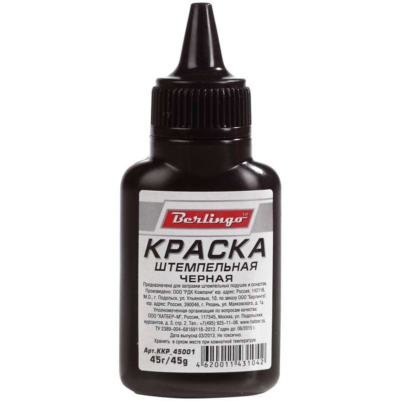 Главная / Товары / КАНЦТОВАРЫ / УПАКОВКА / ХОЗ ТОВАРЫ / РАСХОДНЫЕ МАТЕРИАЛЫ / Канцелярские товары - Офисные / Офисные принадлежности / Штемпельные принадлежности / Штемпельные краски / Штемпельная краска Berlingo, 45мл, черная