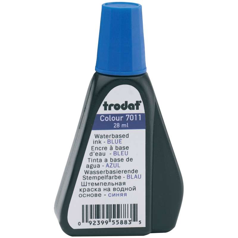 Штемпельная краска на водной основе для заправки штемпельных подушек. Цвет краски - синий. Объем 28 мл.Штемпельная краска Trodat, 28мл, синяя