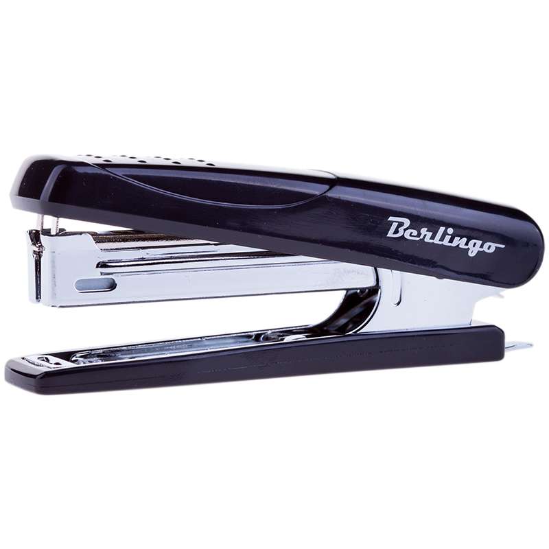 Корпус - пластик, механизм из металла. Оснащен антистеплером. Вмещает 50 скоб №10. Сшивает до 12 листов, глубина захвата - 50 мм.Степлер №10 Berlingo до 12л, пластиковый корпус, черный