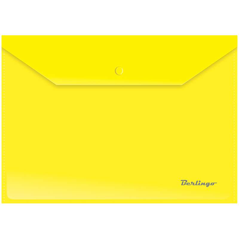 Папка плотно закрывается на кнопку. Кнопка рассчитана на ежедневное использование. Изготовлена из плотного пластика. В ассортименте яркие насыщенные цвета.Папка-конверт на кнопке А4 Berlingo, 180мкм, желтая