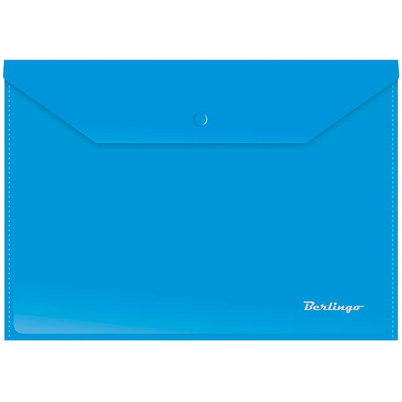 Папка плотно закрывается на кнопку. Кнопка рассчитана на ежедневное использование. Изготовлена из плотного пластика. В ассортименте яркие насыщенные цвета.Папка-конверт на кнопке А4 Berlingo, 180мкм, синяя