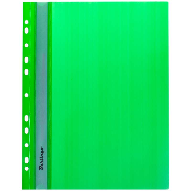 Папка-скоросшиватель с прозрачным верхним листом. Для хранения документов А4. Снабжена универсальной перфорацией. Изготовлена из плотного пластика. Усиленный пластиковый корешок с индексной полосой для размещения информации.Папка-скоросшиватель пластик. перф. А4 Berlingo, 180мкм, зеленая
