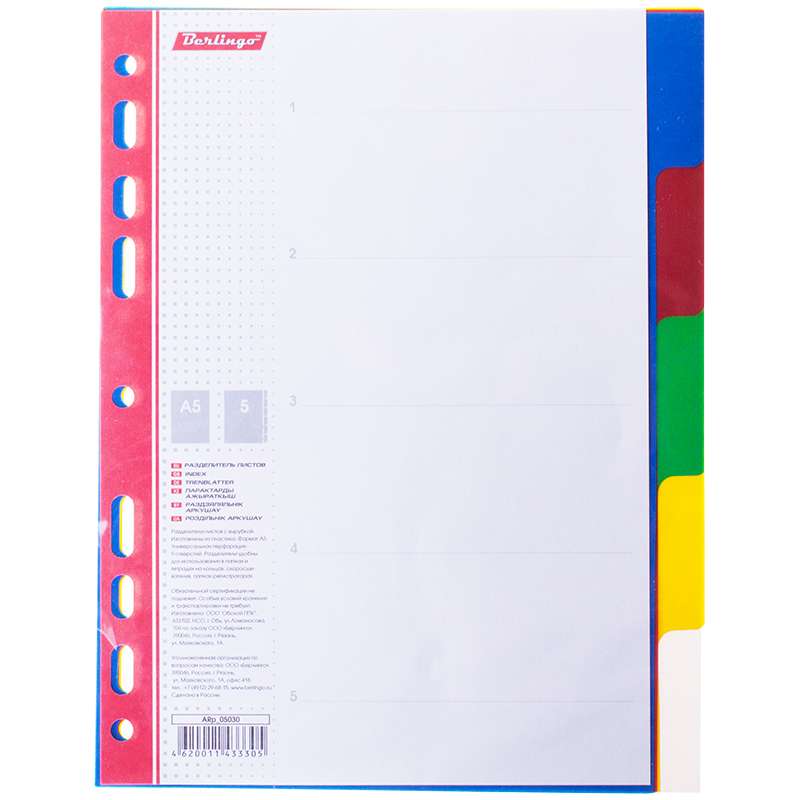 Набор цветовых разделителей. Формат А5. Обеспечивают сохранность и аккуратность листов. Удобны в использовании с папками-регистраторами и на кольцах.226208 Разделитель листов А5 "5 цветов", пластиковый ARp_05030 [РЦ]