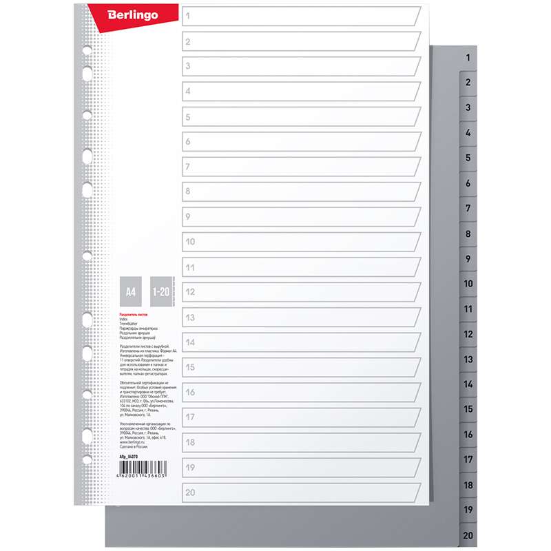 Разделители пластиковые, формат А4. Обеспечивают сохранность и аккуратность листов. Удобны в использовании с папками-регистраторами и папками на кольцах. Индивидуальная упаковка в плёнку, затем в гофрокороб.Разделитель листов А4 Berlingo "1-20 цифры", пластиковый