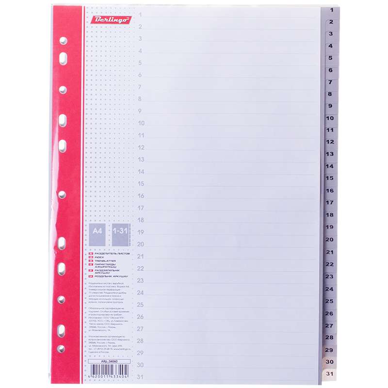Набор разделителей. Формат А4. Обеспечивают сохранность и аккуратность листов. Удобны в использовании с папками-регистраторами и на кольцах.Разделитель листов А4 Berlingo "1-31 цифры", пластиковый