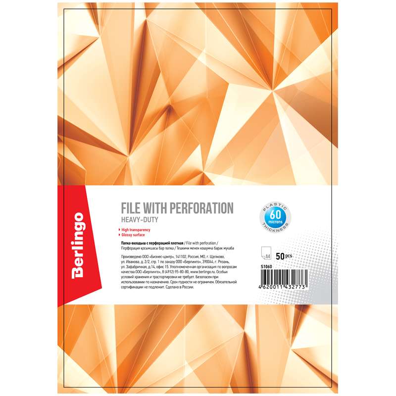 Папка-вкладыш с глянцевой поверхностью. Яркий информационный лист-вкладыш А4 в каждой групповой упаковке (50 шт). Толщина пластика 60 мкм.220787 Папка-вкладыш с перфорацией Berlingo, А4, 60мкм, глянцевая (50 шт в упак.) S1060 [РЦ]
