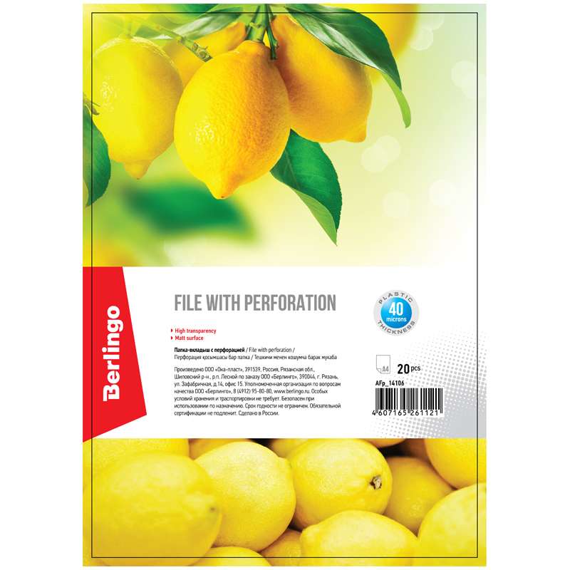 Универсальная перфорация, подходит для любых папок. Яркий информационный лист-вкладыш А4 в каждой групповой упаковке (20 шт.) и логотип на боковой ленте. Вместимость - до 60 листов бумаги 80 г/м².Папка-вкладыш с перфорацией Berlingo, А4, 40мкм, матовая (20 шт в упак.)