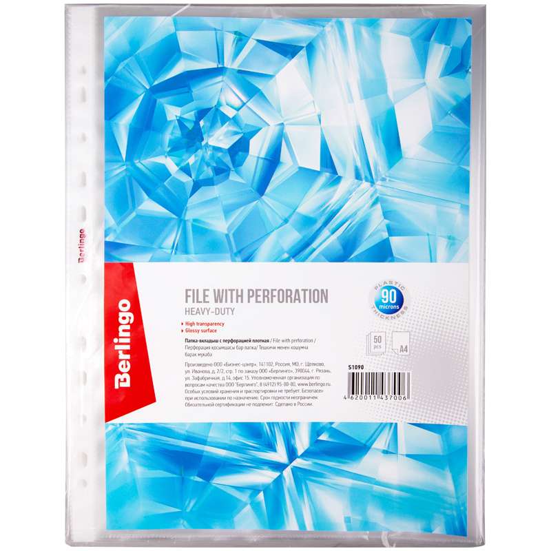 Папка-вкладыш с глянцевой поверхностью. Яркий информационный лист-вкладыш А4 в каждой групповой упаковке (50 шт). Толщина пластика 90 мкм. Папка-вкладыш предназнчена для защиты листов бумаги от внешних воздействий.Папка-вкладыш с перфорацией Berlingo, А4, 90мкм, глянцевая