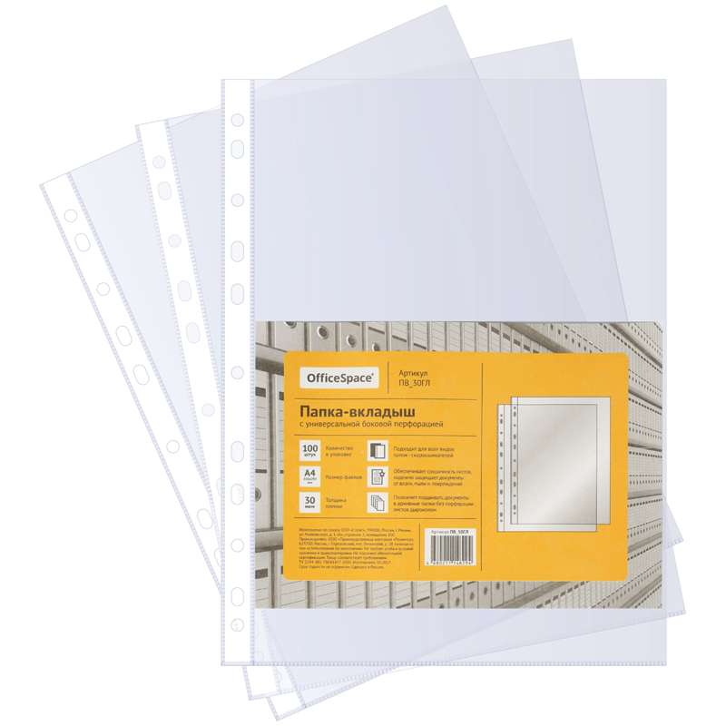 Папка-вкладыш, формат А4. Вертикальная загрузка. Универсальная перфорация, подходит для любых папок.Папка-вкладыш с перфорацией OfficeSpace, А4, 30мкм, глянцевая