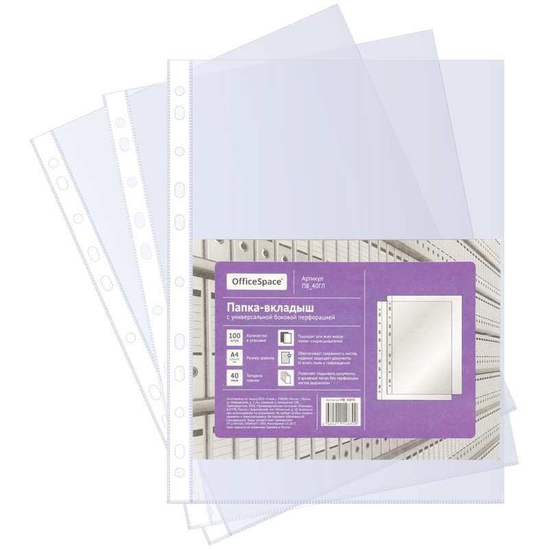 Папка-вкладыш, формат А4. Вертикальная загрузка. Универсальная перфорация, подходит для любых папок.Папка-вкладыш с перфорацией OfficeSpace, А4, 40мкм, глянцевая