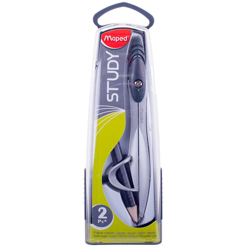 Циркуль, 12 см., с универсальным держателем. Металлические штанги. Ударопрочный пластиковый футляр с подвесом. Карандаш в комплекте. Цвет: металлик с вставками ассорти: зеленой, розовой или серой.Циркуль Maped "Study" металлический, 120мм, с держателем, пластиковый футляр