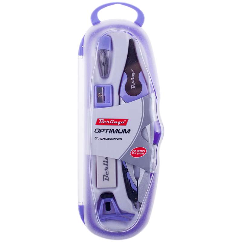 Эргономиная головка/держатель циркуля. В составе циркуль+запасной грифель+универсальная насадка+точилка для грифели+ластик.грифель+универсальная насадка. В пластиковом пенале.Готовальня Berlingo "Optimum", 5 предметов, циркуль 135мм, пластиковый футляр