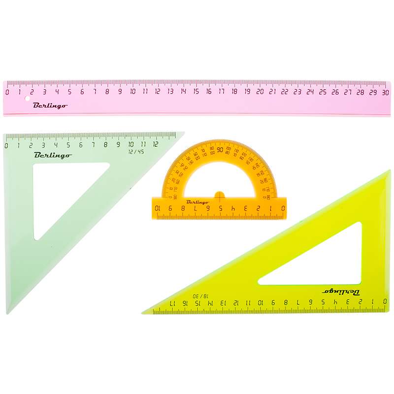Главная / Товары / КАНЦТОВАРЫ / УПАКОВКА / ХОЗ ТОВАРЫ / РАСХОДНЫЕ МАТЕРИАЛЫ / Канцелярские товары - Офисные / Письменные и чертежные принадлежности / Чертежные принадлежности / Линейки, треугольники, транспотриры / Набор чертежный большой Berlingo, (треуг. 2шт., линейка 30см, транспортир), прозрачный флуоресцентный