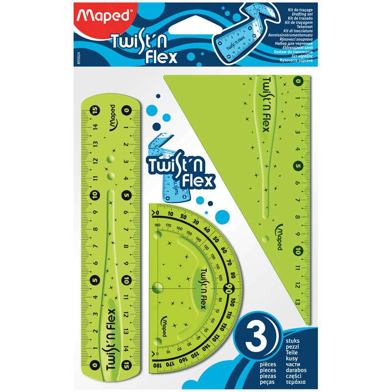 Н-р для черчения TWIST'N FLEX из 3-х предметов: линейка 15 см, угольник 15 см, транспортир 10 см, 180°. Гибкий, неломающийся пластик. Цвет ассорти: синий, зеленый, сиреневый.Набор чертежный Maped "Twist'n flex", (треуг. 15см, линейка 15см, транспортир 10см), европодвес
