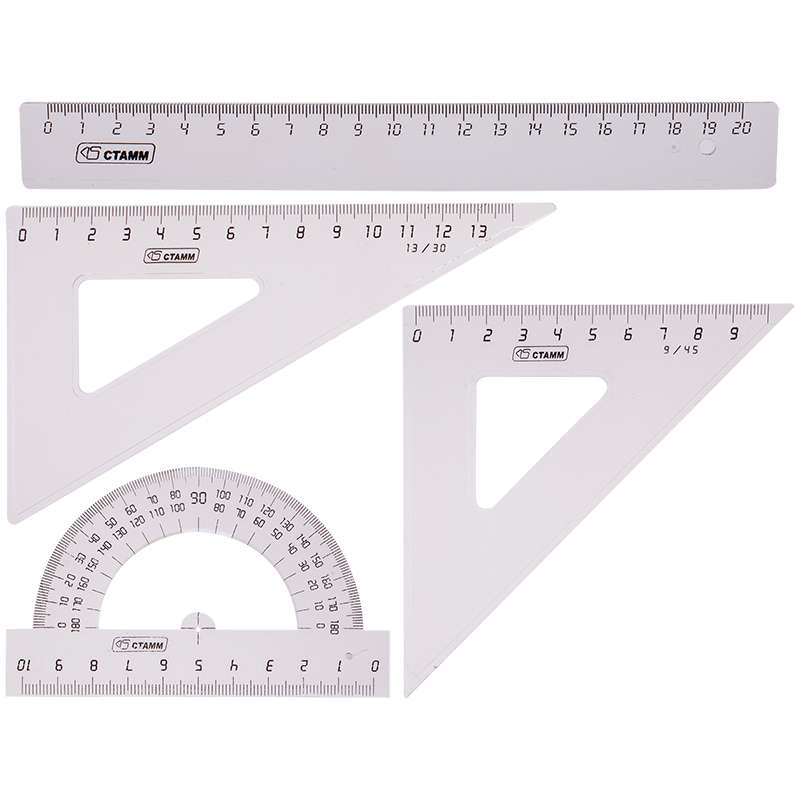 Главная / Товары / КАНЦТОВАРЫ / УПАКОВКА / ХОЗ ТОВАРЫ / РАСХОДНЫЕ МАТЕРИАЛЫ / Канцелярские товары - Офисные / Письменные и чертежные принадлежности / Чертежные принадлежности / Линейки, треугольники, транспотриры / Набор чертежный средний Стамм, (треуг. 2шт., линейка 20см, транспортир), прозрачный бесцветный