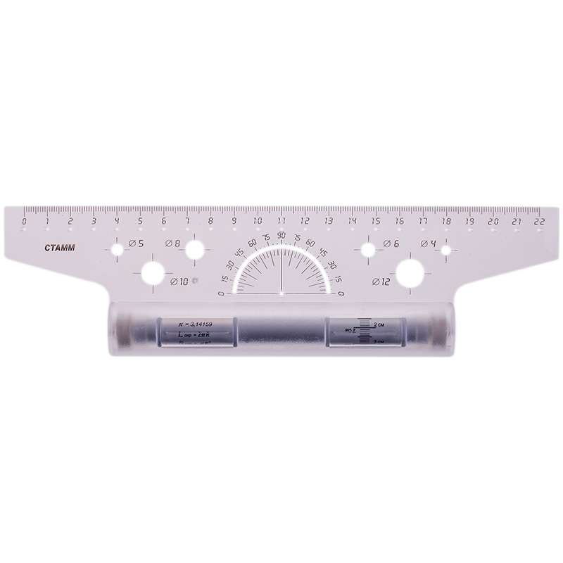 Содержит транспортир 180 градусов и трафареты окружностей. Пластиковый/металлический ролик. Равномерно перемещается по бумажной поверхности. Изготавливается из высококачественного пластика на современном оборудовании.Рейсшина 22см Стамм, металлический ролик