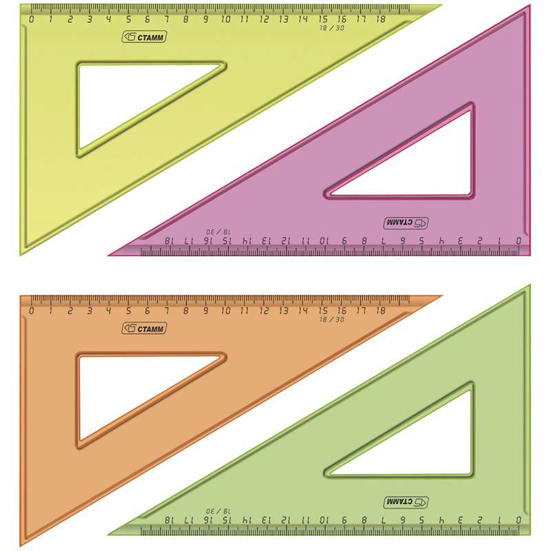 Незаменима для уроков труда, черчения, геометрии и математики. Безупречное качество пластика, ровная четкая миллиметровая шкала. Материал прочный полистирол.Треугольник 30°, 18см Стамм, прозрачный флуоресцентный, 4цв.