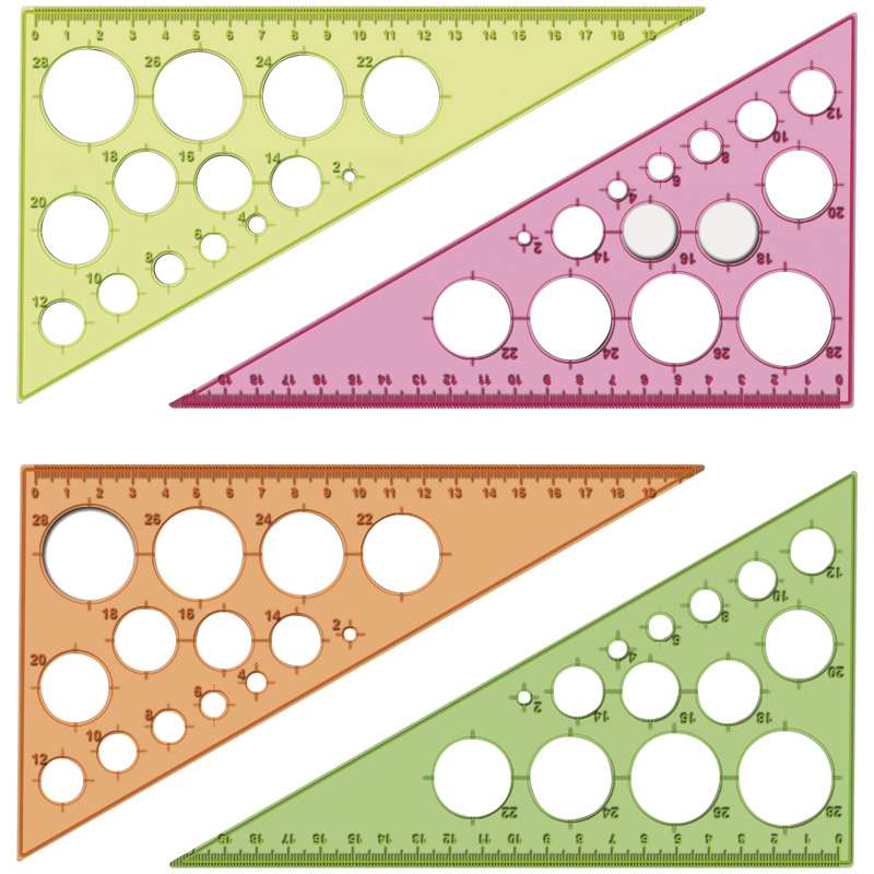 Прямоугольный треугольник с углами при основании 30 и 60 градусов. Используется для занятий черчением, построения графиков, проектирования. В полотне предусмотрены отверстия для вычерчивания окружностей разных диаметров. Длина стороны с делениями 190 мм.Треугольник 30°, 19см Стамм, прозрачный флуоресцентный, 4цв., с окружностями