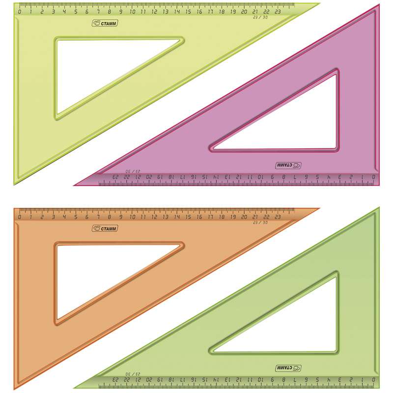 Незаменима для уроков труда, черчения, геометрии и математики. Безупречное качество пластика, ровная четкая миллиметровая шкала. Материал прочный полистирол.Треугольник 30°, 23см Стамм, прозрачный флуоресцентный, 4цв.