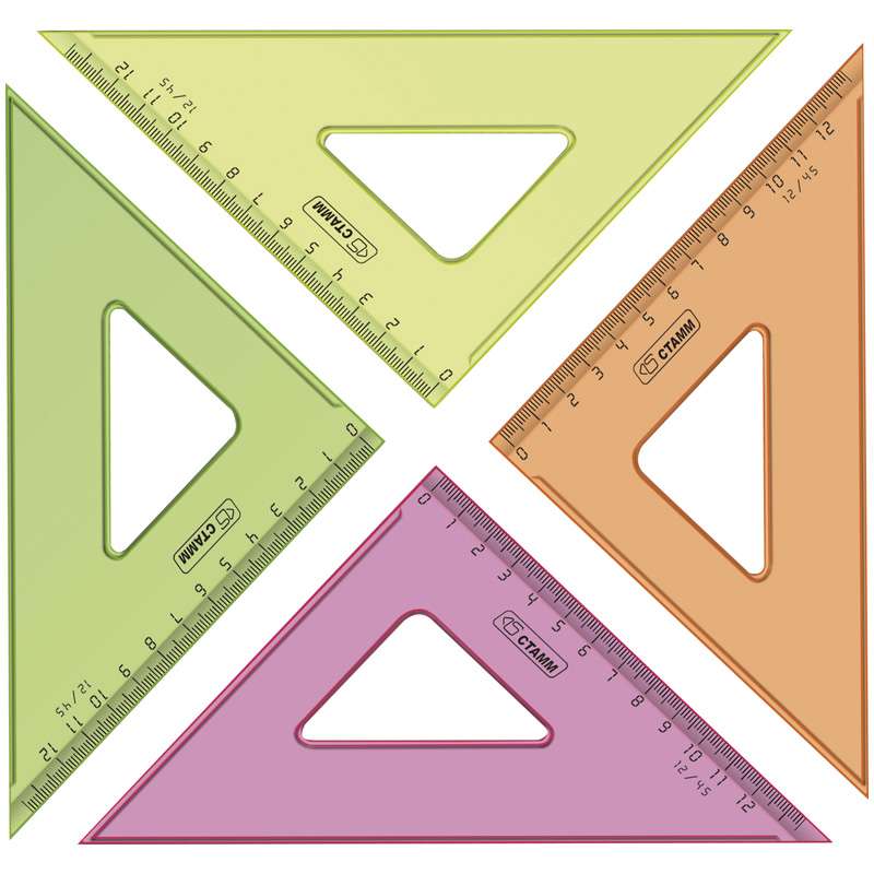 Незаменима для уроков труда, черчения, геометрии и математики. Безупречное качество пластика, ровная четкая миллиметровая шкала. Материал прочный полистирол.Треугольник 45°, 12см Стамм, прозрачный флуоресцентный, 4цв.