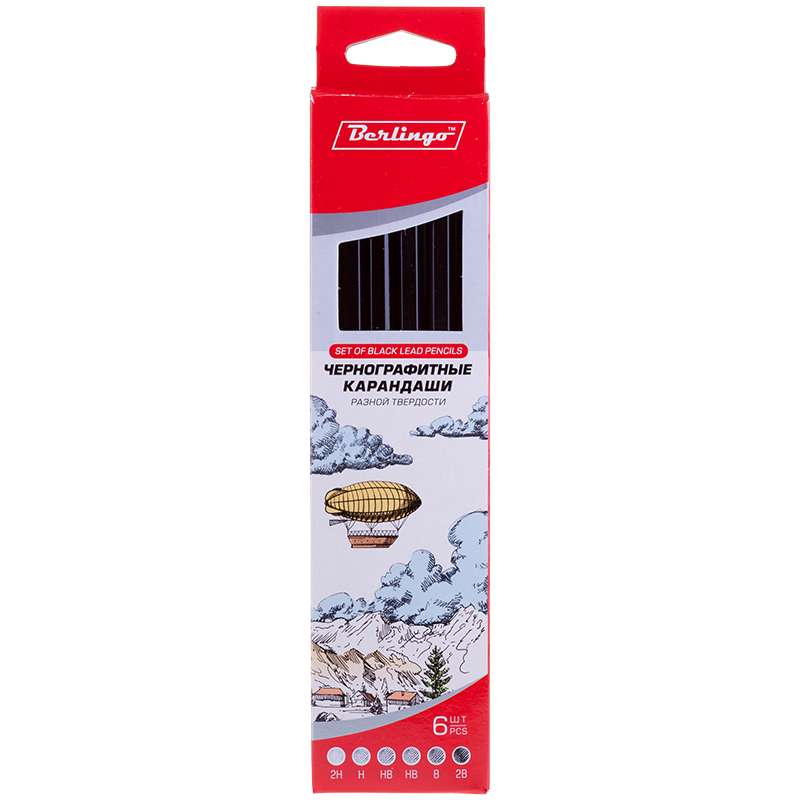 Набор из 6 чернографитных карандашей из липы, с заточкой разной твердости. Подходит для черчения и рисования. Диаметр стержня 2мм, твердость 2H-2B, шестигранной формы, с логотипом на корпусе. Трехцветная окраска корпуса. Упаковка в картонную коробку с европодвесомНабор карандашей ч/г Berlingo, 6шт., 2H-2B, заточен., картон. упак., европодвес