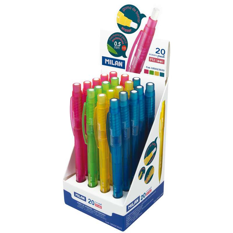 Мехаческий карандаш в прозрачном тонированном корпусе с выдвигающимся ластиком. В дисплее по 20 механических карандашей в корпусах розового, голубого, салатового и желтого цветаКарандаш механический Milan "PL1 Look", 0,5мм, с ластиком