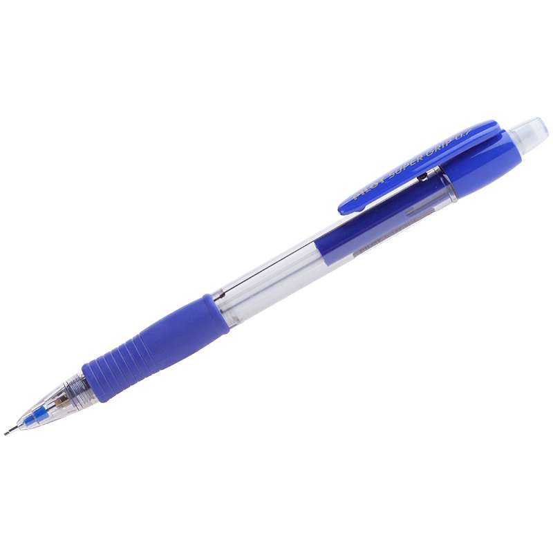 Карандаш механический в прозрачном пластиковом корпусе с резиновым упором, препятствующим выскальзывание карандаша из пальцев, и убирающейся металлической цангой.Карандаш механический Pilot "Super Grip", 0,7мм, с ластиком, синий корпус