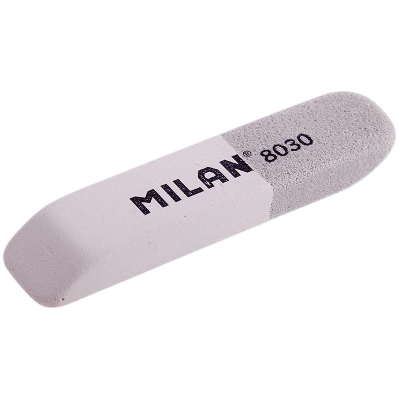 Классические ластики с добавлением двух видов абразивов. Позволяют удалять с бумаги чернила и стирать цветные карандашиЛастик Milan "8030", скошенный, комбинированный, натуральный каучук, 60*14*7мм
