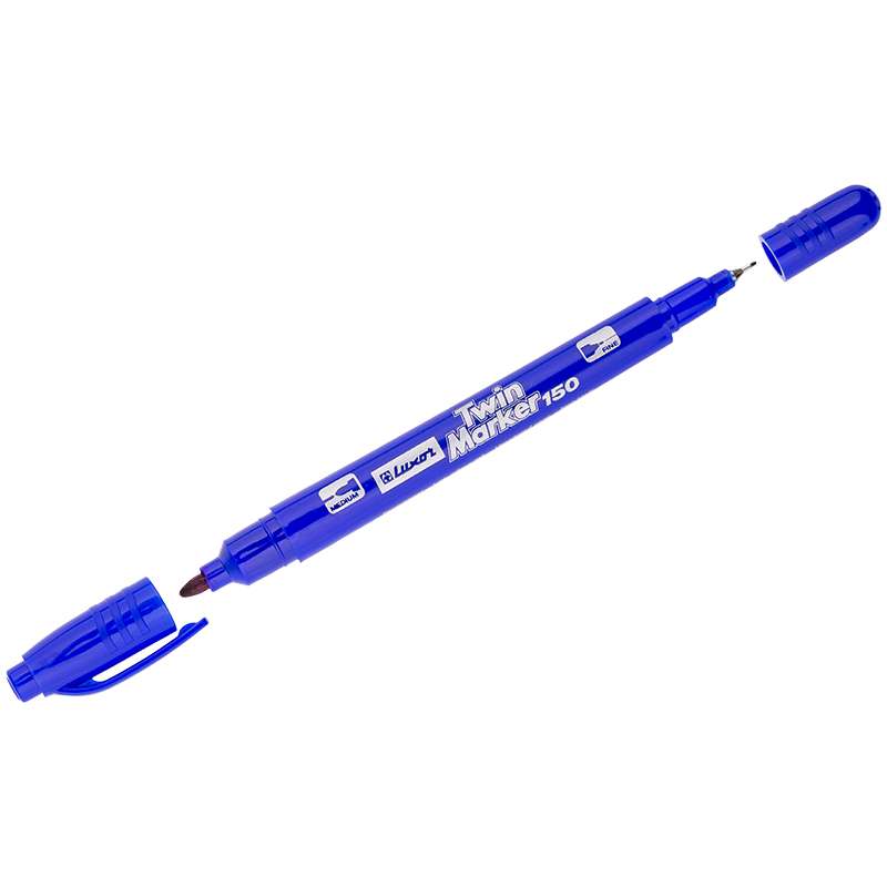 Двухсторонний перманентный маркер без ксилола. Два наконечника - пулевидный и игольчатый - для нанесения линий разной толщиныМаркер перманентный двухсторонний Luxor "150" синий, пулевидный, 0,7/1мм
