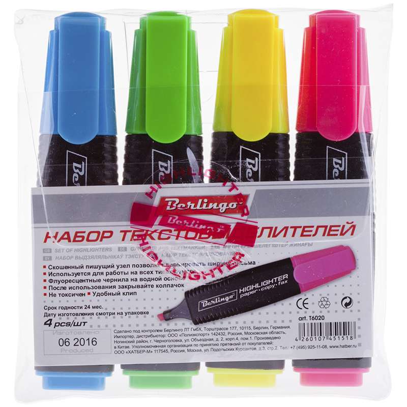 Текстовыделители с флуоресцентными чернилами на водной основе. В наборе - 4 цвета (желтый, зеленый, синий, розовый). Толщина линии от 1 до 5 мм. Удобный клип. Цвет колпачка и торцевого элемента соответствует цвету чернил. Упаковка - прозрачный ПВХ-пенал с европодвесом.113156 Набор текстовыделителей Berlingo 4цв., 1-5мм, ПВХ уп., европодвес T6020 [РЦ]