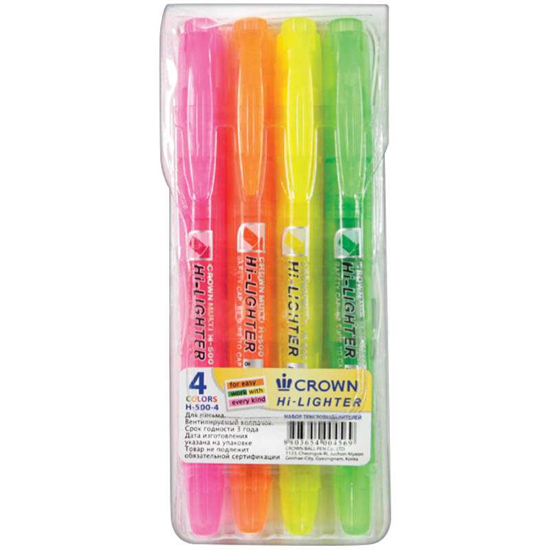 Набор текстовыделителей "H-500". Толщина линии 4 мм., 4 цвета (желтый, оранжевый, розовый, зеленый). Скошенный наконечник одинаково удобен для закрашивания и проведения тонких линий. Подходят для любого типа бумаги: обычная, фотобумага, факсовая и другая.207925 Набор текстовыделителей "Multi Hi-Lighter" 4цв., 1-4мм, ПВХ уп., европодвес H-500-4 [РЦ]