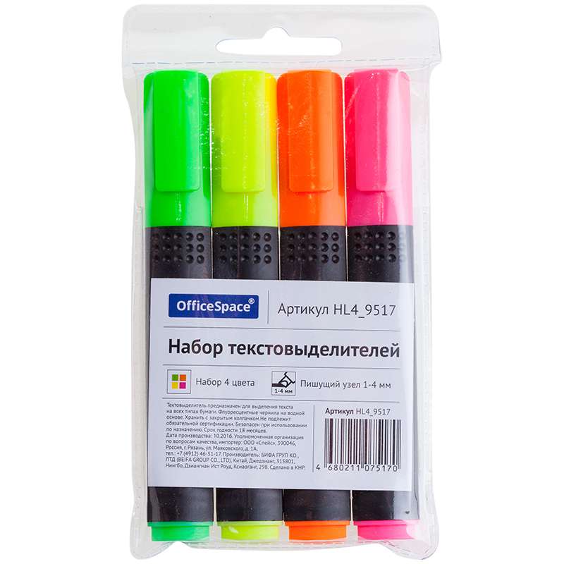 Главная / Товары / КАНЦТОВАРЫ / УПАКОВКА / ХОЗ ТОВАРЫ / РАСХОДНЫЕ МАТЕРИАЛЫ / Канцелярские товары - Офисные / Письменные и чертежные принадлежности / Маркеры и текстовыделители / Текстовыделители / Набор текстовыделителей OfficeSpace 4цв., 1-4мм, чехол с европодвесом