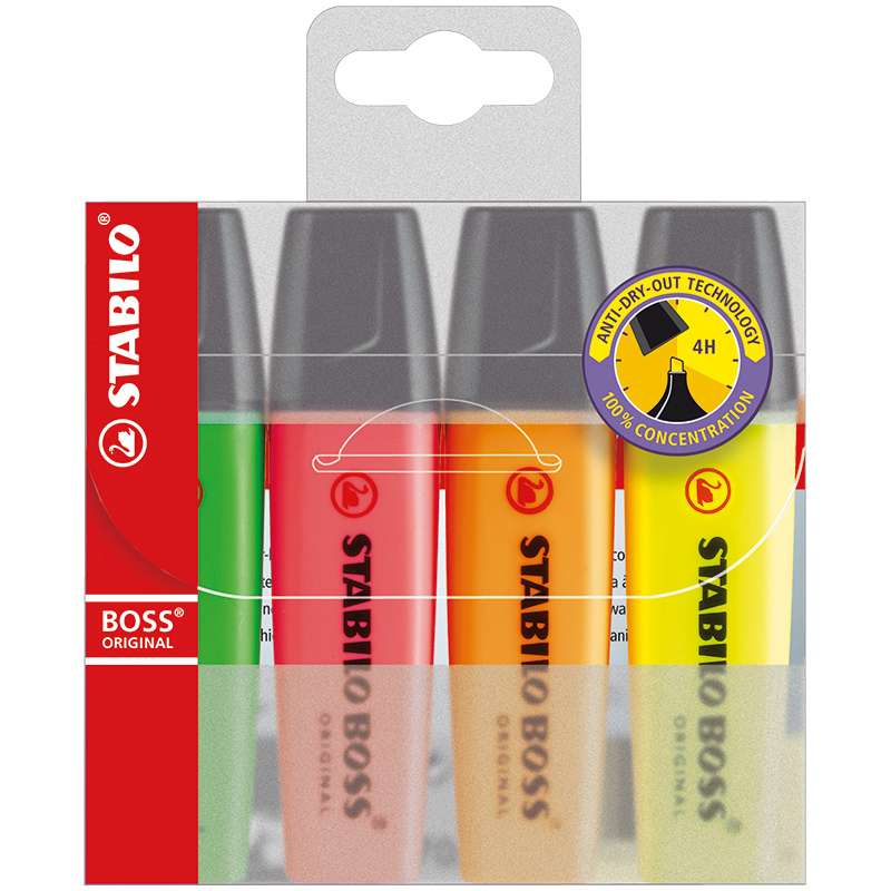 Текстовыделитель для любых видов бумаги. Безупречное качество и функциональность. Длительный срок службы благодаря большому запасу чернил и их экономичному расходу. Износоустойчивый клиновидный наконечник позволяет проводить идеально ровные линии толщиной от 2 до 5 мм. Долгое время сохраняет работоспособность без колпачка. Чернила на водной основе не имеют запаха, мгновенно высыхают и отличаются высокой яркостью и светостойкостью. Цвет корпуса соответствует цвету чернил. Упаковка в коробку по 4 шт: желтый, розовый, оранжевый, зеленый.Набор текстовыделителей "Boss Original" 4цв., 2-5мм, ПВХ уп., европодвес