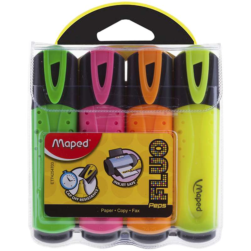 Главная / Товары / КАНЦТОВАРЫ / УПАКОВКА / ХОЗ ТОВАРЫ / РАСХОДНЫЕ МАТЕРИАЛЫ / Канцелярские товары - Офисные / Письменные и чертежные принадлежности / Маркеры и текстовыделители / Текстовыделители / Набор текстовыделителей Maped "Fluo Pep's Classic" 4цв., 1-5мм, чехол с европодвесом