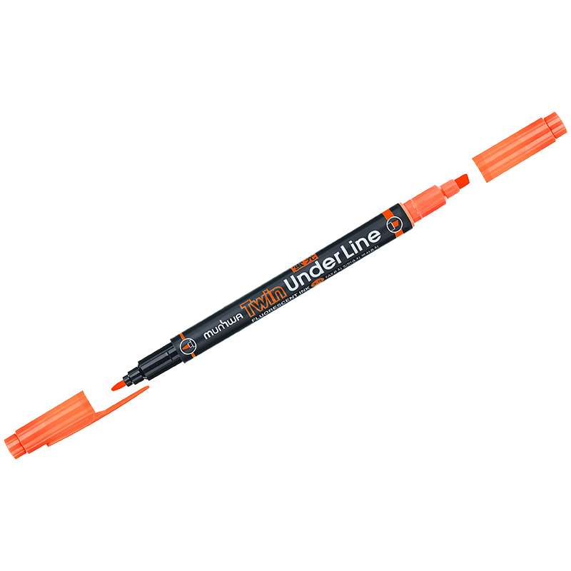 Двухсторонний текстовыделитель в круглом корпусе. Цвет колпачков соответсвует цвету чернил. Два наконечника: скошенный для выделения текста и пулевидный для подчеркивания необходимой информацииТекстовыделитель двухсторонний "Twin UnderLine", оранжевый, 4/0,5мм