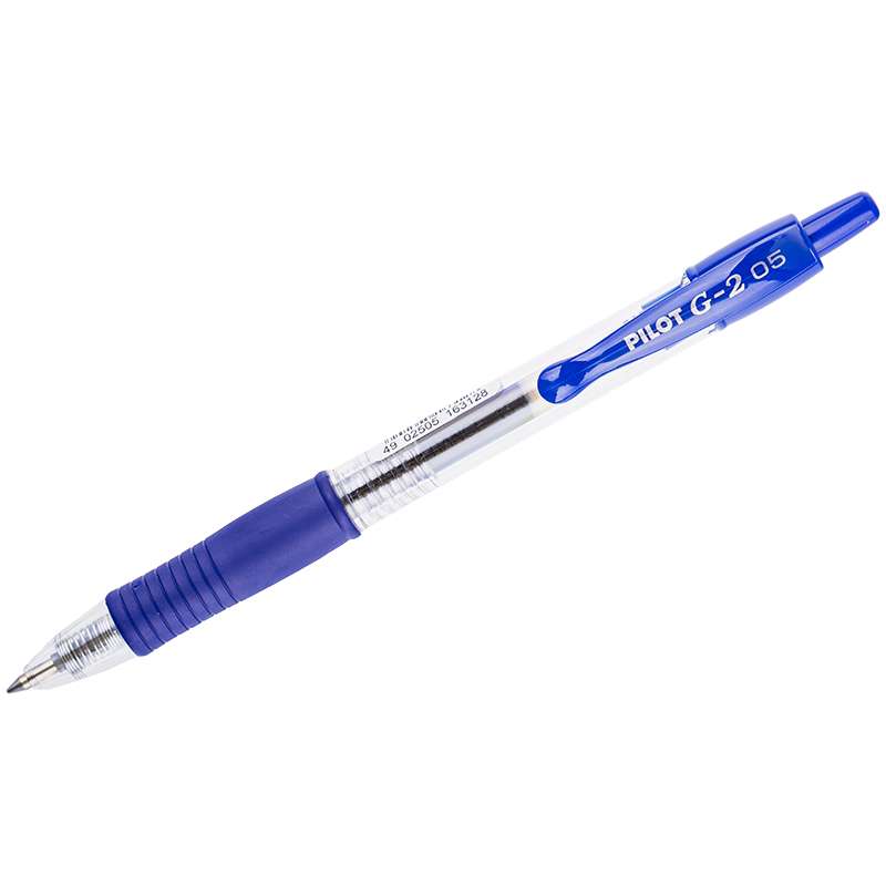Ручка гелевая с автоматическим механизмом. Материал корпуса - пластик, резиновый грип предотвращает скольжение ручки в пальцах. Толщина пишущего узла - 0,5 мм. Цвет чернил - синий.Ручка гелевая автоматическая Pilot "G-2" синяя, 0,5мм, грип