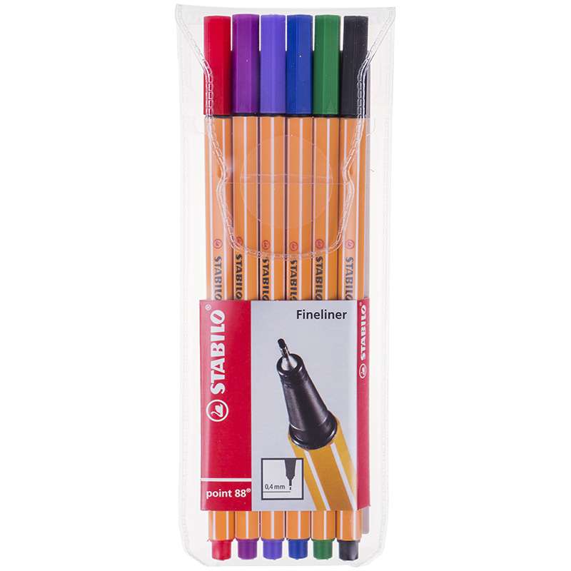 Набор капиллярных ручек STABILO Point 88. Толщина линии 0,4 мм. Шесть цветов: синий, черный, красный, зеленый, фиолетовый, сиреневый.Набор капиллярных ручек "Point 88" 06цв., 0,4мм