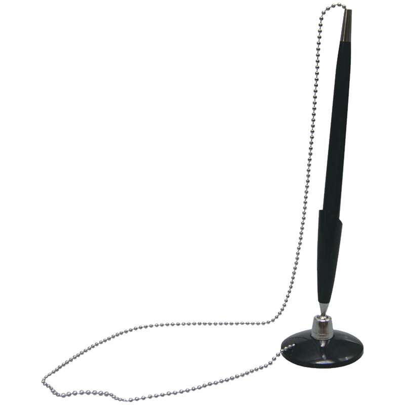 Настольная шариковая ручка на цепочке. Подставка с регулируемым углом наклона ручки для более удобного использования. Подставка фиксируется на ровной поверхности с помощью клейкого основания. Идеально подходит для мест с высокой проходимостью: стойки регистрации, банки, ресепшен и др.Ручка шариковая настольная, синяя, 0,7мм, черный корпус, металлическая цепочка