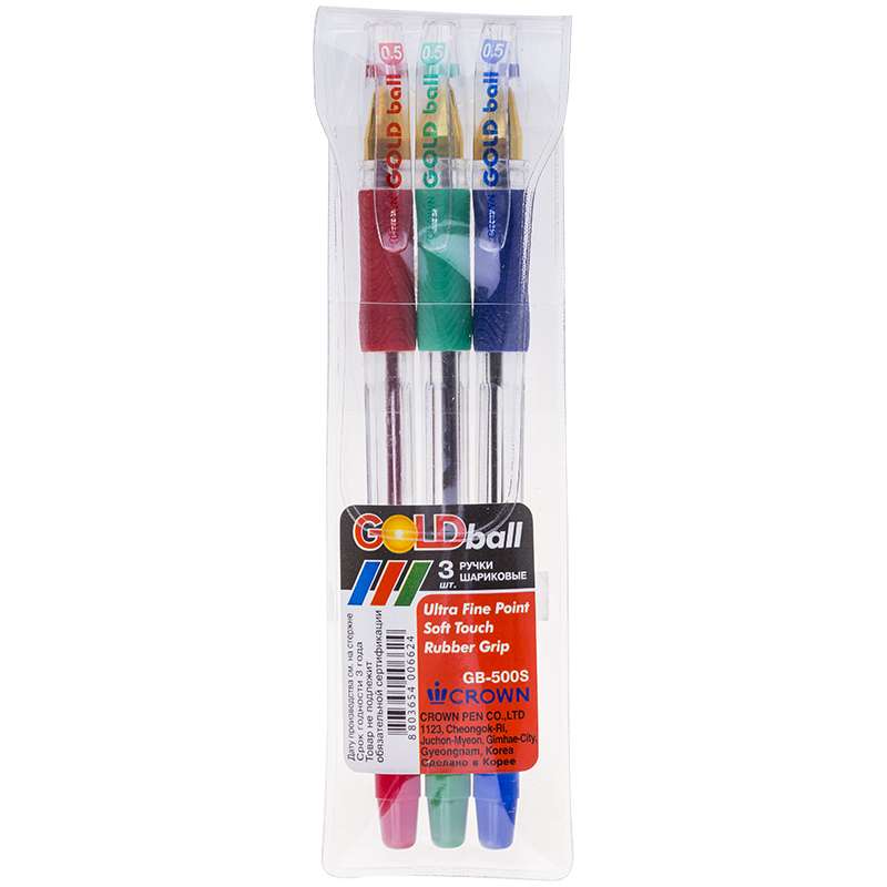 Главная / Товары / КАНЦТОВАРЫ / УПАКОВКА / ХОЗ ТОВАРЫ / РАСХОДНЫЕ МАТЕРИАЛЫ / Канцелярские товары - Офисные / Письменные и чертежные принадлежности / Ручки / Ручки шариковые / Набор шариковых ручек Crown "Gold Ball", 3шт., 3цв., 0,5мм, грип, ПВХ уп., европодвес