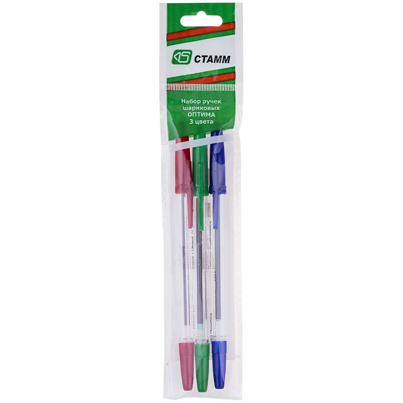 Главная / Товары / КАНЦТОВАРЫ / УПАКОВКА / ХОЗ ТОВАРЫ / РАСХОДНЫЕ МАТЕРИАЛЫ / Канцелярские товары - Офисные / Письменные и чертежные принадлежности / Ручки / Ручки шариковые / Набор шариковых ручек Стамм "Оптима", 3шт., 3цв., 0,7мм, европодвес