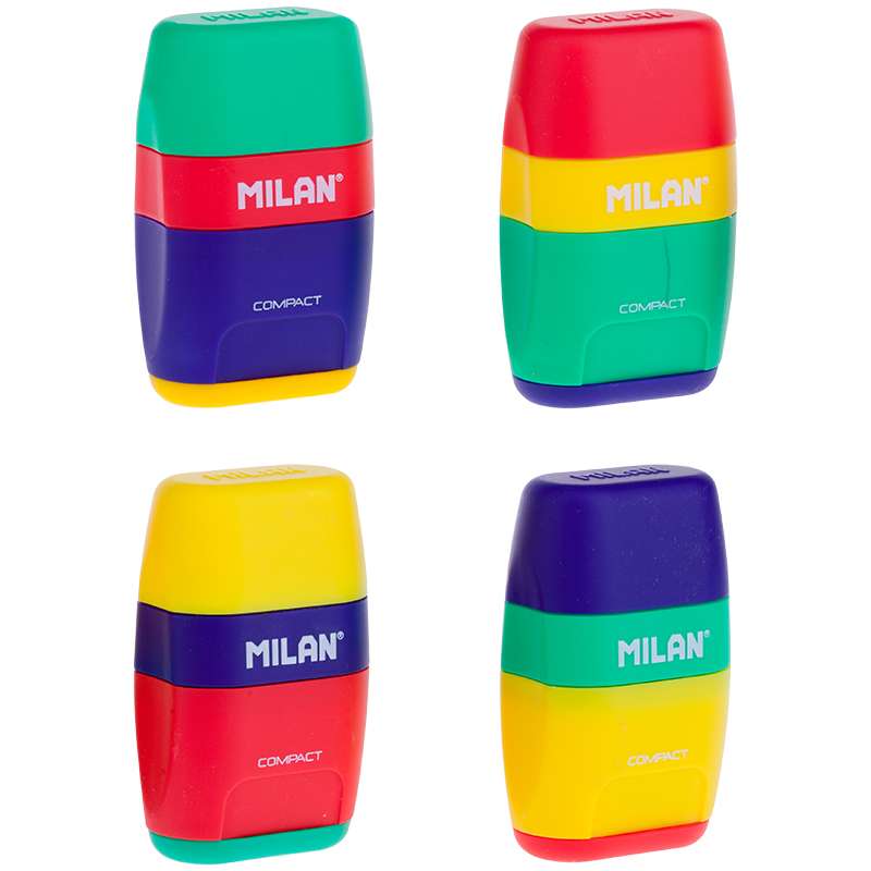 Ластик+точилка COMPACT MIX. Стальное лезвие, острое и устойчивое, идеально подходит для графитовых карандашей и цветных карандашей. Мягкий синтетический каучуковый ластик, подходит для широкого спектра графитовых карандашейТочилка пластиковая с ластиком Milan "Compact Mix", 2 отверстия, контейнер, ассорти
