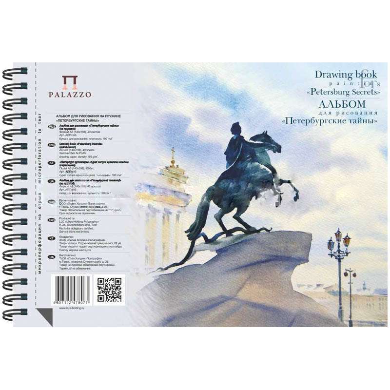 Предназначен для рисования акварелью, гуашью, чернографитным карандашом, сухой пастелью и восковыми мелками. Альбом на пружине состоит из 40 листов рисовальной бумаги (гладкой без тиснения) плотностью 160 г/м2, c перфорацией и на жесткой подложке. Бумага подходит для размыва и большого ровного нанесения краски, а также выдерживает многочисленные подправки и стирания ластиком. Рекомендуется как начинающим художникам, так и профессионалам.Альбом для акварели 40л. А5 на пружине "Петербургские тайны", 160 гр/м2