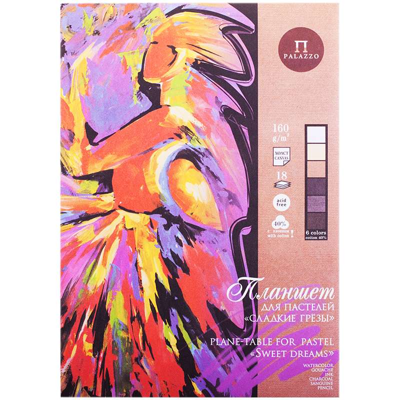 Замечательно подходит для художественных техник, таких как пастель, масляная пастель, мел, карандаш или уголь, сангина. Планшет состоит из 18 листов и 6 цветов пастельной бумаги с жесткой подложкой из переплетного картона. Внутренний блок для удобства проклеен с 2-х сторон по корешку. Бумага внутреннего блока имеет плотность 160 г/м2, cостоит из 40 % хлопкового волокна и имеет тиснение "холст" с одной стороны как все импортные аналоги, предназначенные для пастельных работ. Каждое изделие упаковано в термоусадочную пленку.Планшет для пастелей 18л. А4 "Сладкие грезы", 160г/м2, 6 цветов, "Холст"