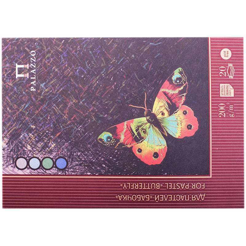 Специальная бумага предназначена для рисования пастелью. Блок - плотная тонированная офсетная бумага формата А4, 20 листов. Обложка - мелованный картон.Планшет для пастелей 20л. А4 "Бабочка", 200г/м2, 4-х цветная тонированная