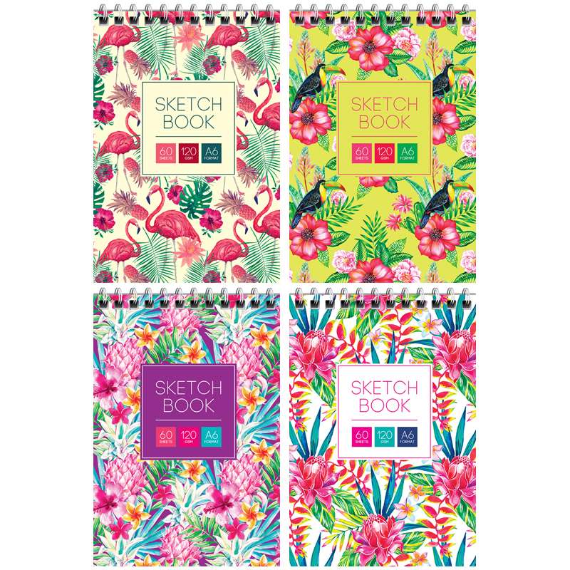Блокнот для набросков, эскизов, зарисовок в различных видах техники рисования: карандашом, сангиной, соусом, углем, пастелью и тушью. Состоит из рисовальной бумаги (не офсет!!!) белого цвета, плотностью 120г/м2, пружина слева и имеет основание из жесткого картона для удобства рисования.Скетчбук-блокнот для эскизов и зарисовок 60л. А6 на гребне "Тропический принт", 120гр/м2