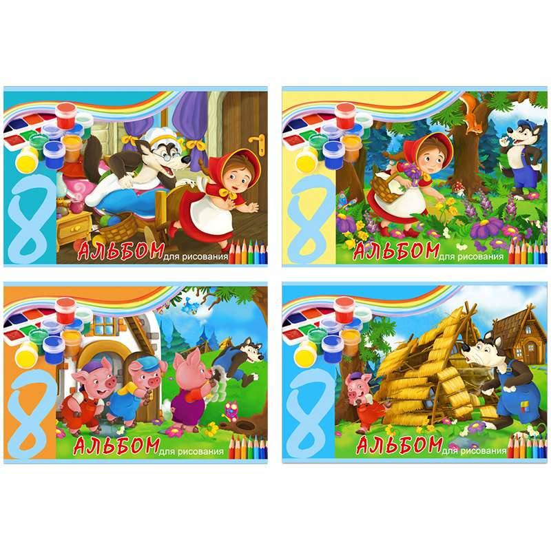 Формат А4. Вид крепления -скрепка. Обложка -мелованный картон. Внутренний блок -офсетный 100 гр/м2. Белизна -92%.Альбом для рисования 08л. А4 на скрепке "Сказки", эконом