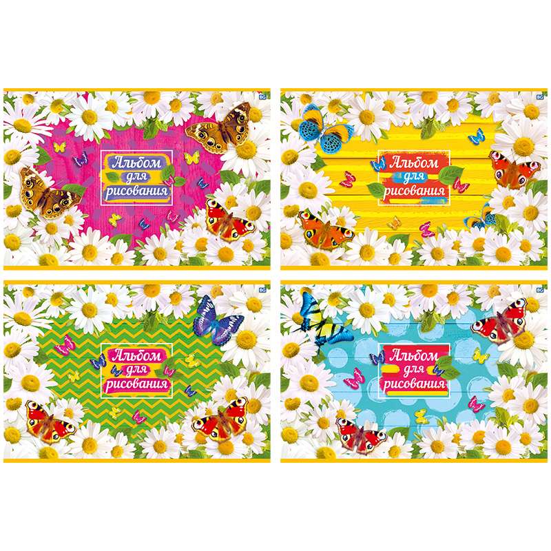 Формат А4. Вид крепления -скрепка. Обложка -мелованный картон. Внутренний блок -офсетный 100 гр/м2Альбом для рисования 12л., А4, на скрепке BG "Бабочки и ромашки"