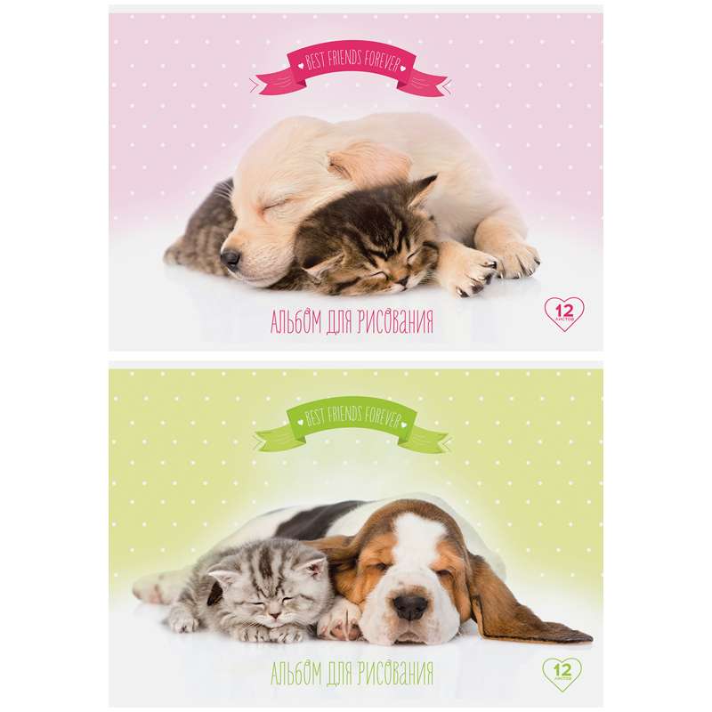 Альбом для рисования формата А4 в обложке из импортного мелованного картона. Внутренний блок из 12 листов офсетной бумаги на скобе. Плотность бумаги — 100 г/кв.м, соответствует Техническому регламенту «О безопасности продукции, предназначенной для детей и подростков». Подходит для рисования различными типами красок, фломастерами, цветными и чернографитными карандашами, гелевыми ручками.Альбом для рисования 12л. А4 на скрепке "Питомцы. Friends forever", блестки