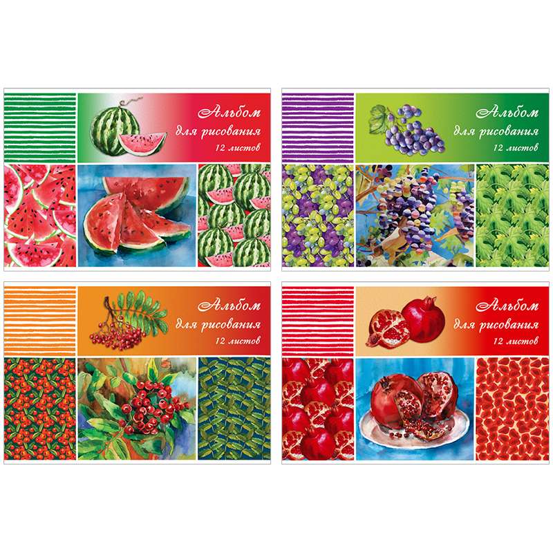 Формат А4. Вид крепления -скрепка. Обложка -мелованный картон. Внутренний блок -офсетный 100 гр/м2Альбом для рисования 12л. А4 на скрепке "Сочные ягоды"